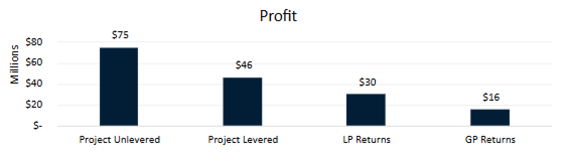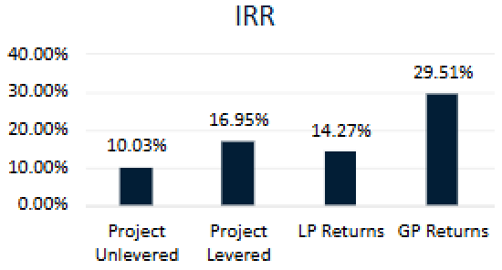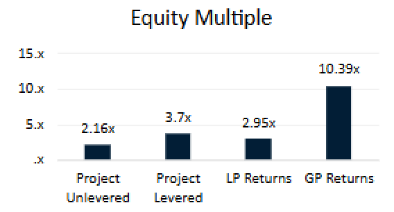 This set of visuals highlights the capital structure, financial performance metrics, and return potential. The charts provide a clear breakdown of returns, including IRR, equity multiples, and profit distributions, while demonstrating the impact of leverage on investment outcomes. These visuals are essential for conveying the deal's structure, performance potential, and investor benefits with transparency and clarity.